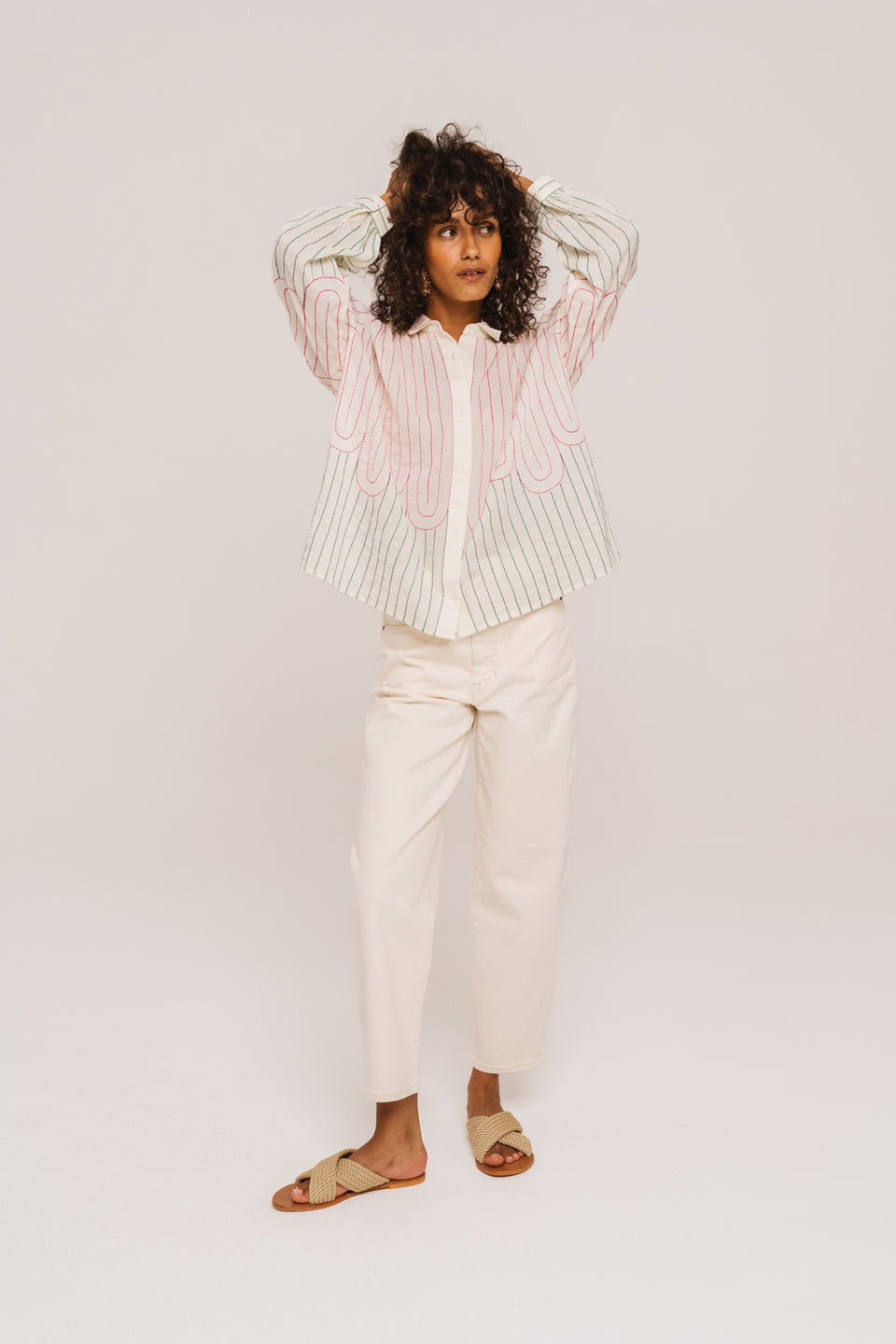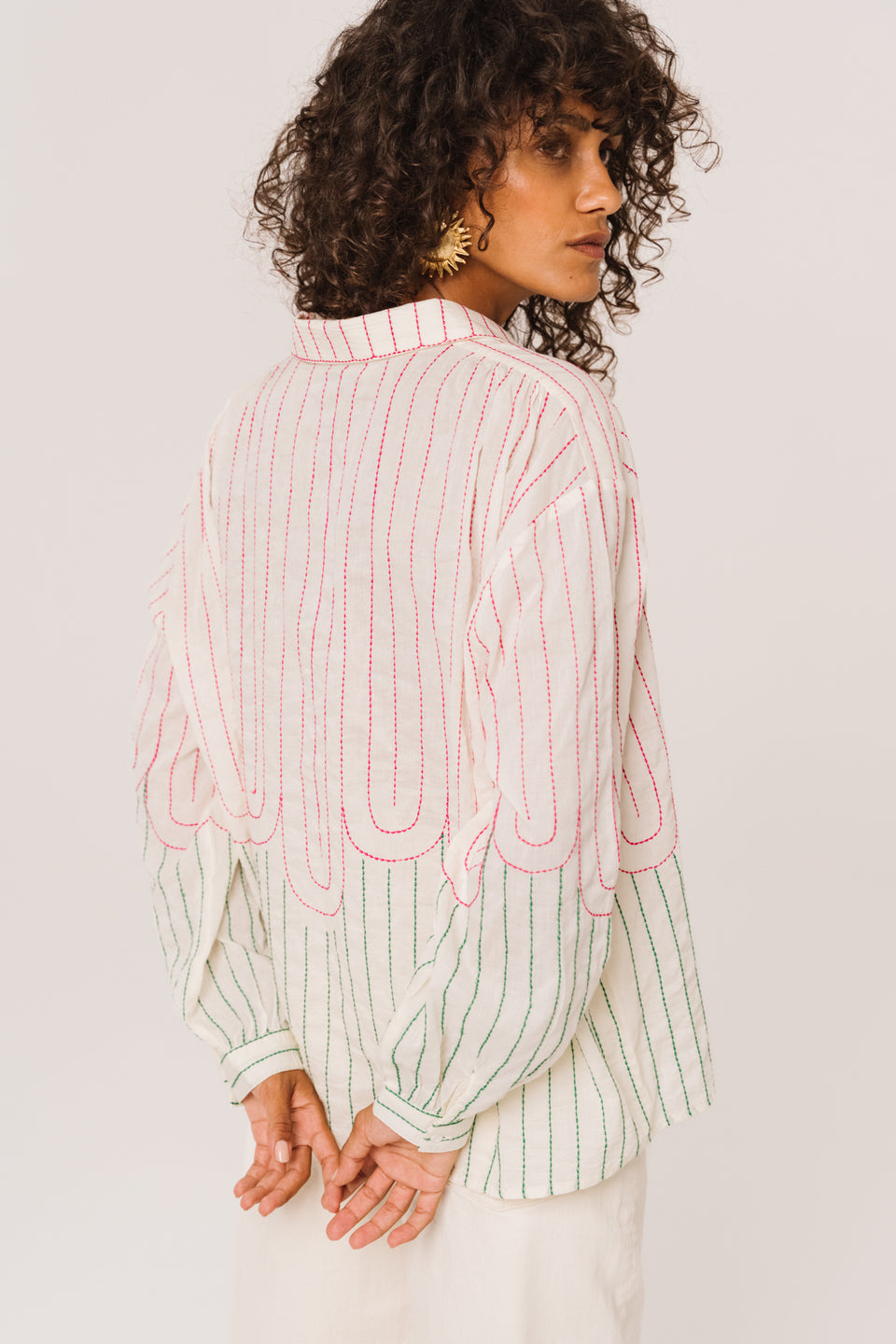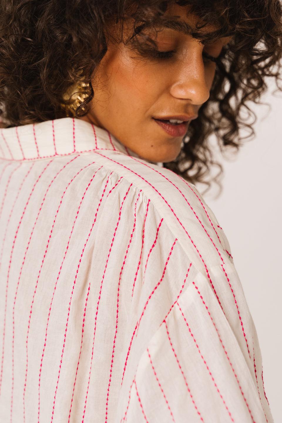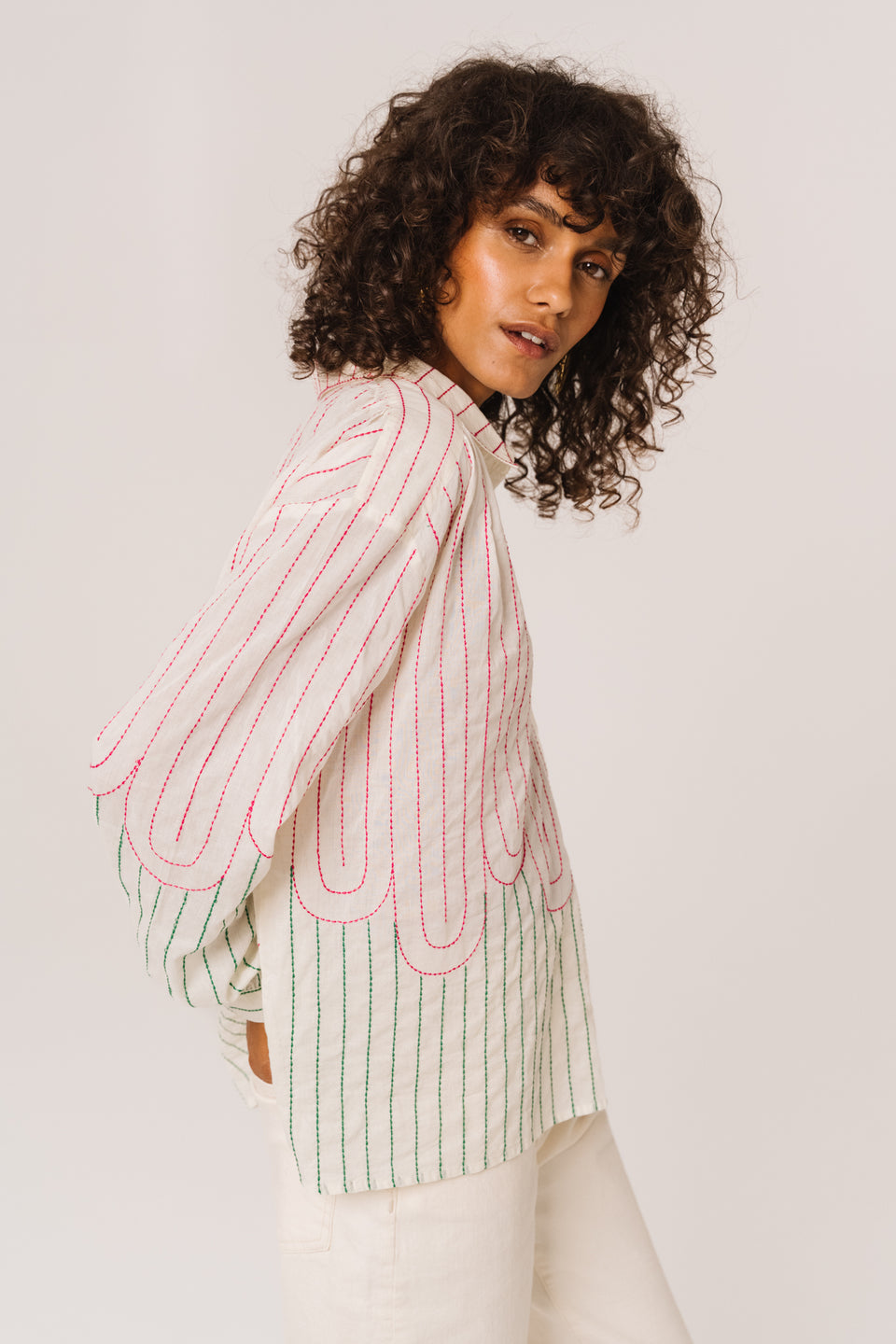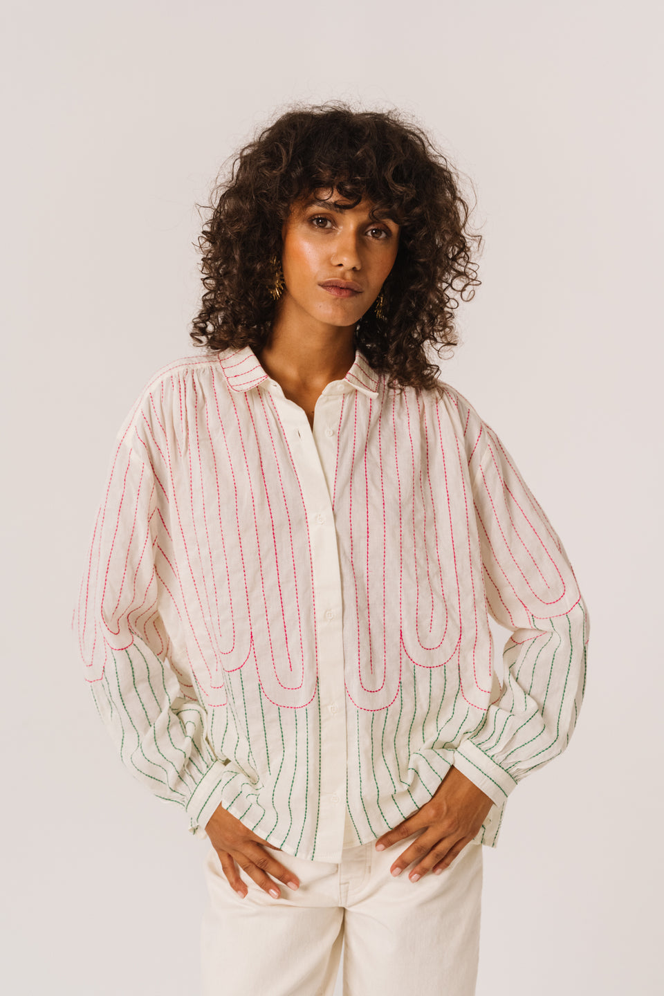 Blouse à manches longues brodée, confectionnée dans un voile de coton léger. Coupe ample et aérienne, col chemise classique. Des fronces délicates aux épaules et aux poignets apportent une touche de féminité.
