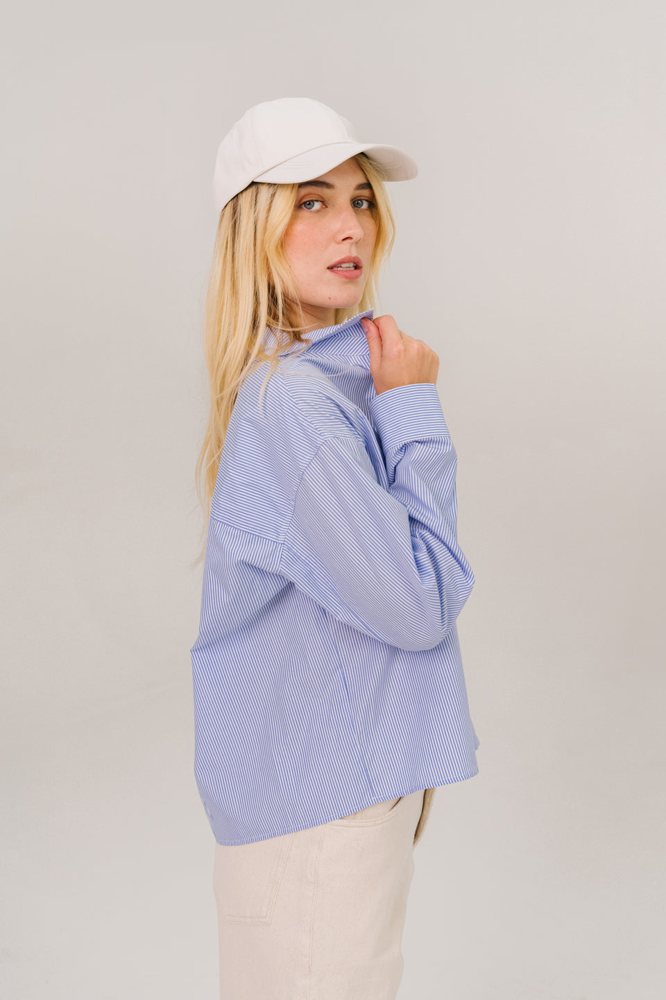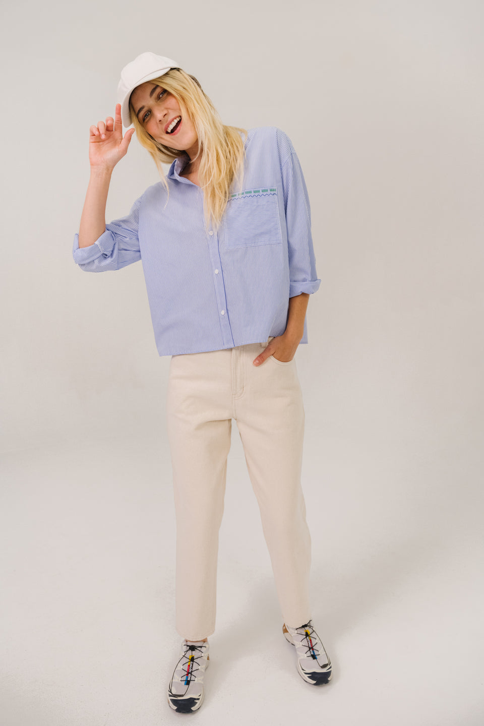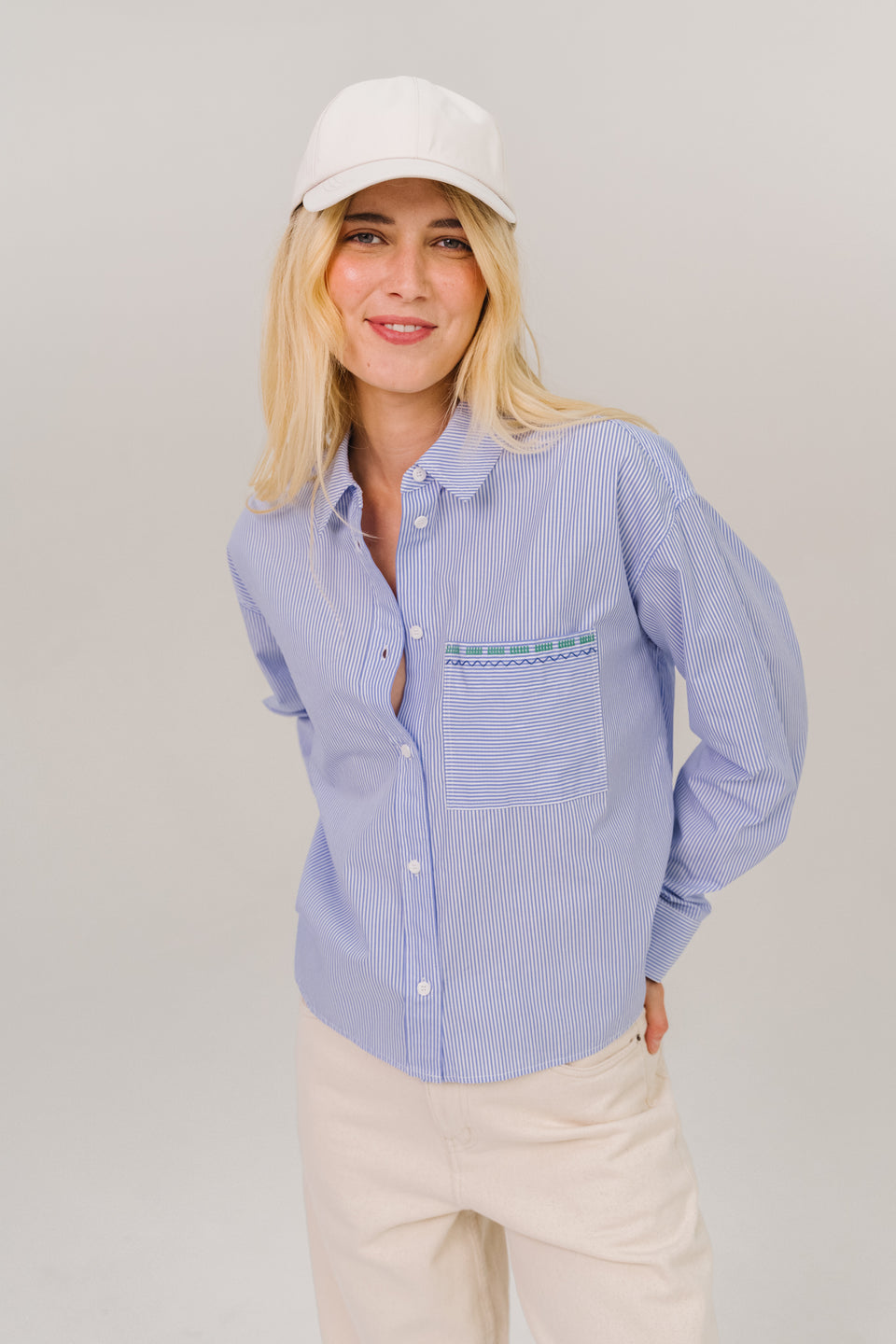 Chemise courte à manches longues en popeline de coton, coupe oversize inspirée du vestiaire masculin. Poche poitrine plaquée ornée d’une broderie multicolore. Col chemise classique, boutonnage apparent et poignets boutonnés pour une allure à la fois affirmée et décontractée.