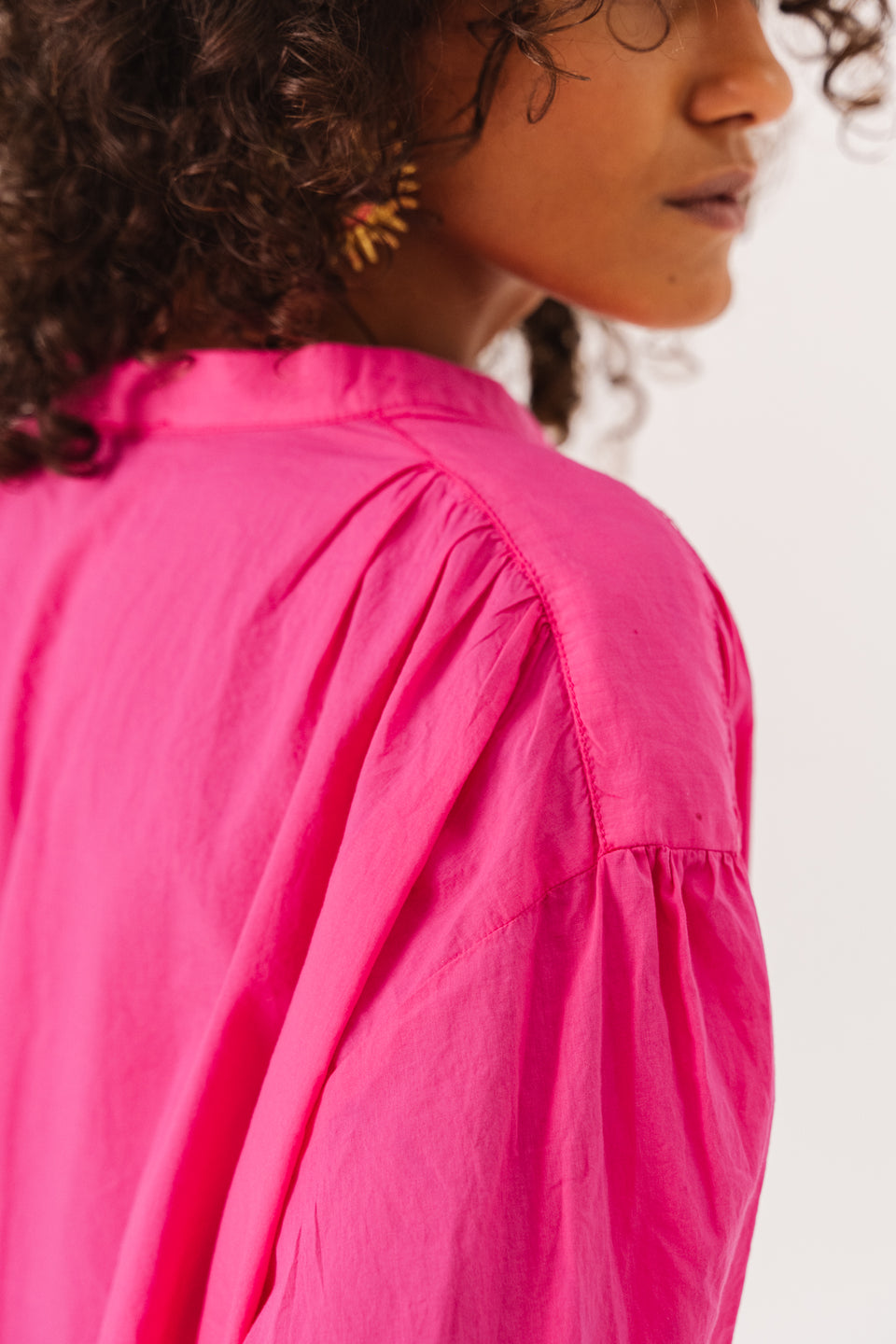 Plain, three-quarter-sleeve blouse in fine cotton poplin. Loose, feminine cut accentuated by gathers at the shoulders, back, and cuffs. Mandarin collar and concealed button fastening for a subtle and elegant touch.