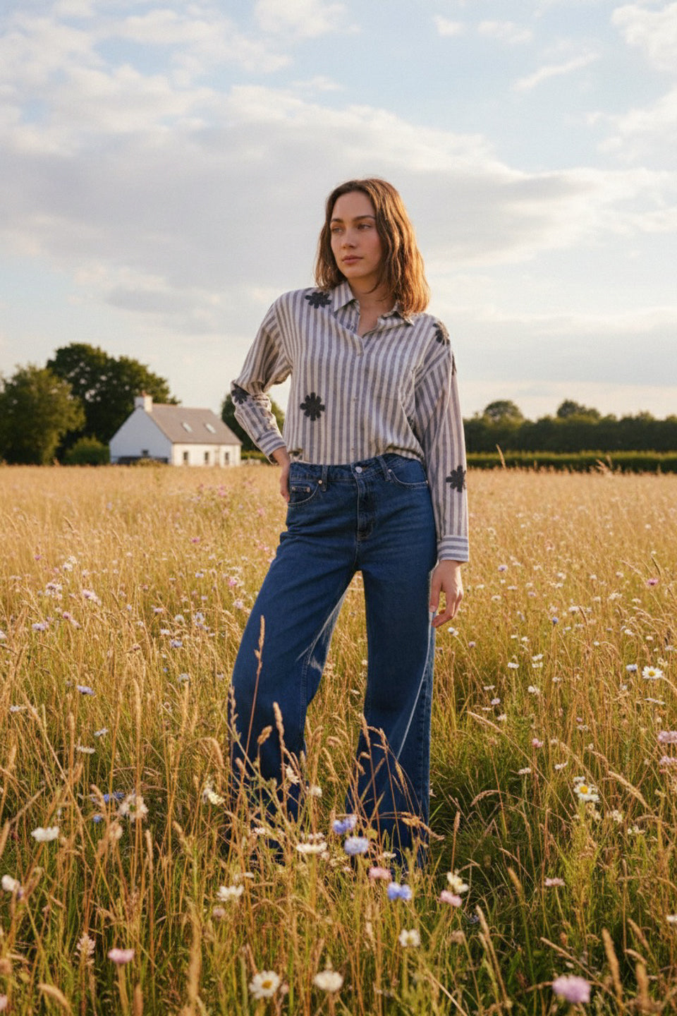 Blouse féminine à manches longues à rayures verticales bleu et gris chiné avec motif étoile anthracite. Confectionnée en coton et viscose. Sa coupe ample, froncée à l’avant et au dos, est sublimée par un col mao fin et un boutonnage apparent. Poignets boutonnés en finition.
