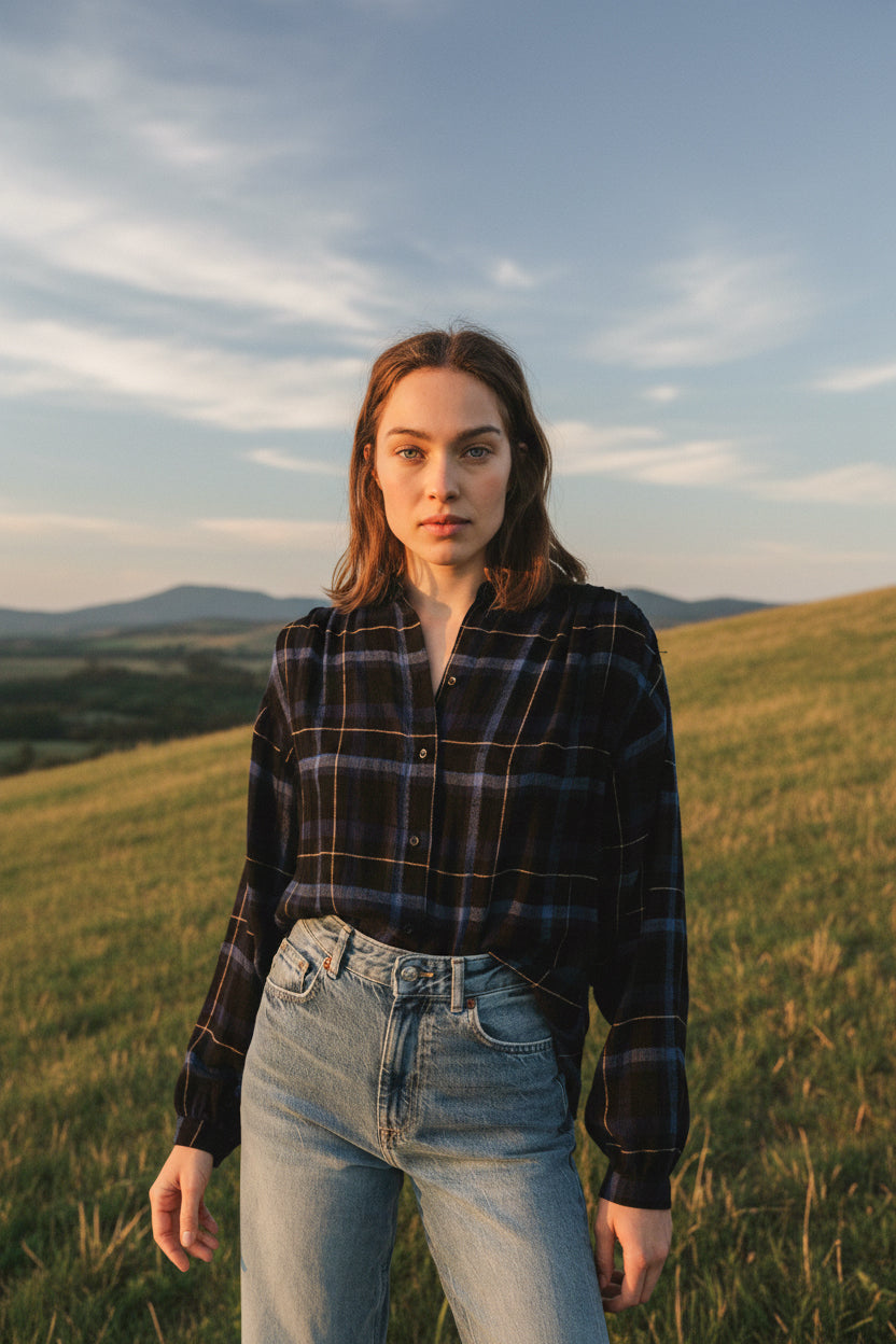 Blouse unie à manches longues, confectionnée dans un mélange de viscose et laine à carreaux noirs et bleus. Sa coupe ample et fluide est mise en valeur par un col mao fin et des fronces à l’avant, au dos et en bas de manches. Les manches légèrement bouffantes apportent légèreté et élégance à la silhouette, tandis que les poignets boutonnés signent une finition délicate.