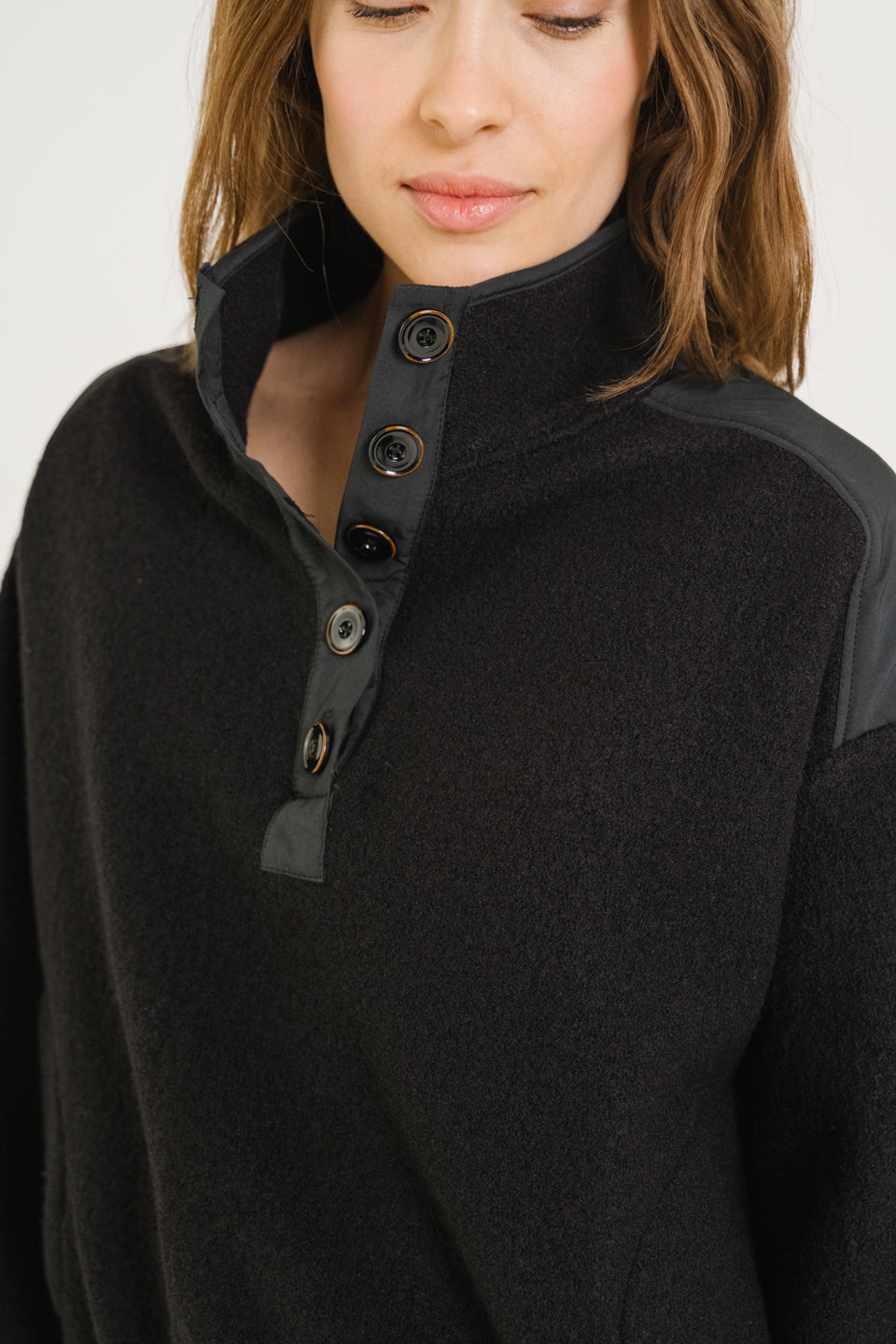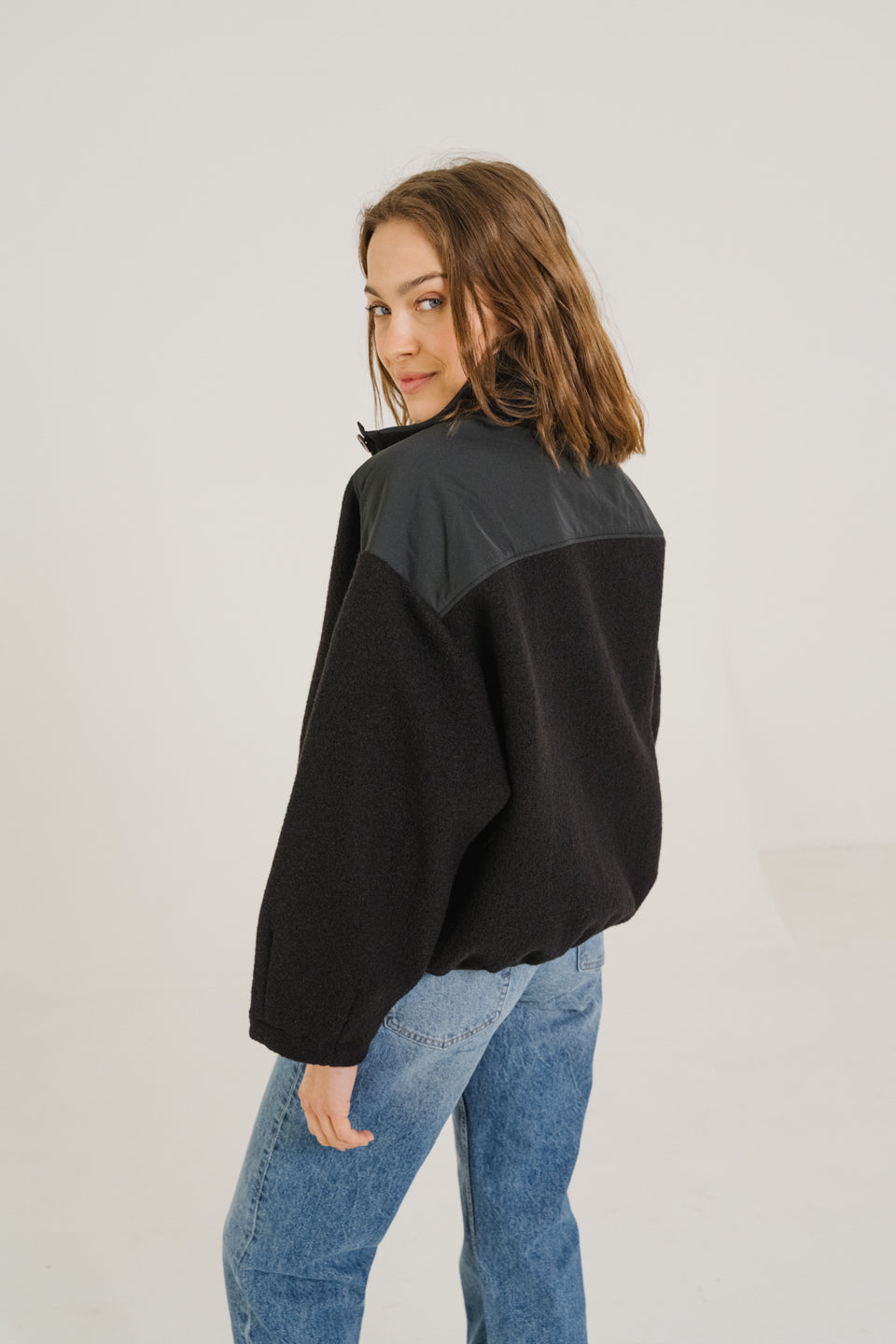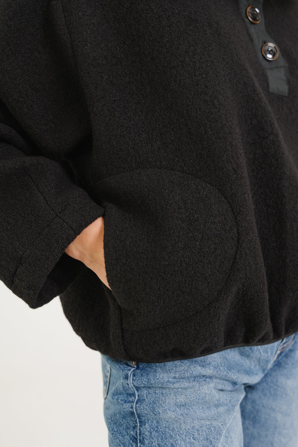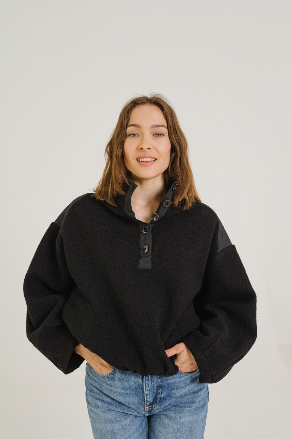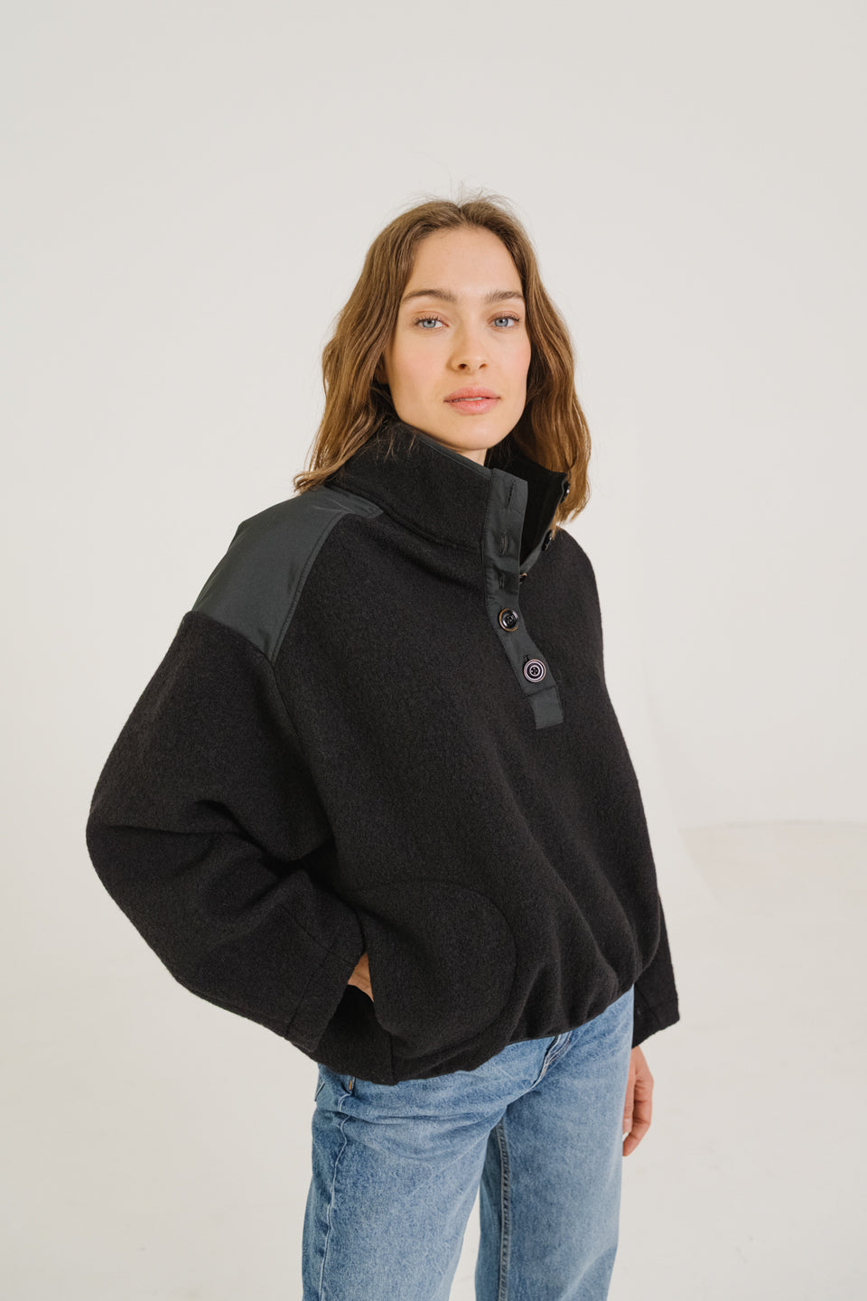Veste courte et ample en laine bouillie noire, au style sweatshirt revisité. Non doublée, elle présente une coupe ronde avec emmanchures basses et manches resserrées par de larges plis pour une silhouette confortable et structurée. Son col montant boutonné, ainsi que les empiècements en nylon satiné anthracite aux épaules et au dos, apportent une touche contemporaine. Poches discrètes dans la couture en finition.