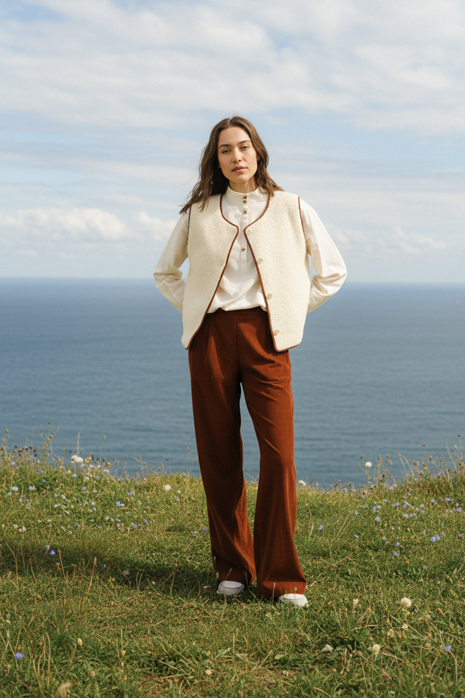 Pantalon taille normale à la jambe évasée, confectionné en baby velours couleur brique, 100% coton. Sa taille élastiquée au dos assure un confort parfait au quotidien, tandis que ses larges plis à l’avant et son ourlet généreux structurent la silhouette avec élégance. Doté de poches italiennes, il conjugue style et aisance avec naturel.
