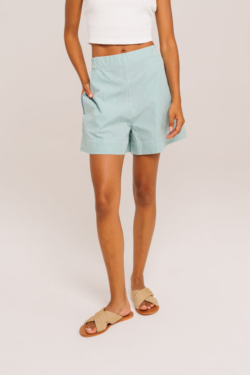 Short mi-cuisse à la coupe trapèze, élastiqué au dos pour plus de confort. Poche discrète dans la couture côté, rehaussée d’une broderie colorée, et poche plaquée au dos.