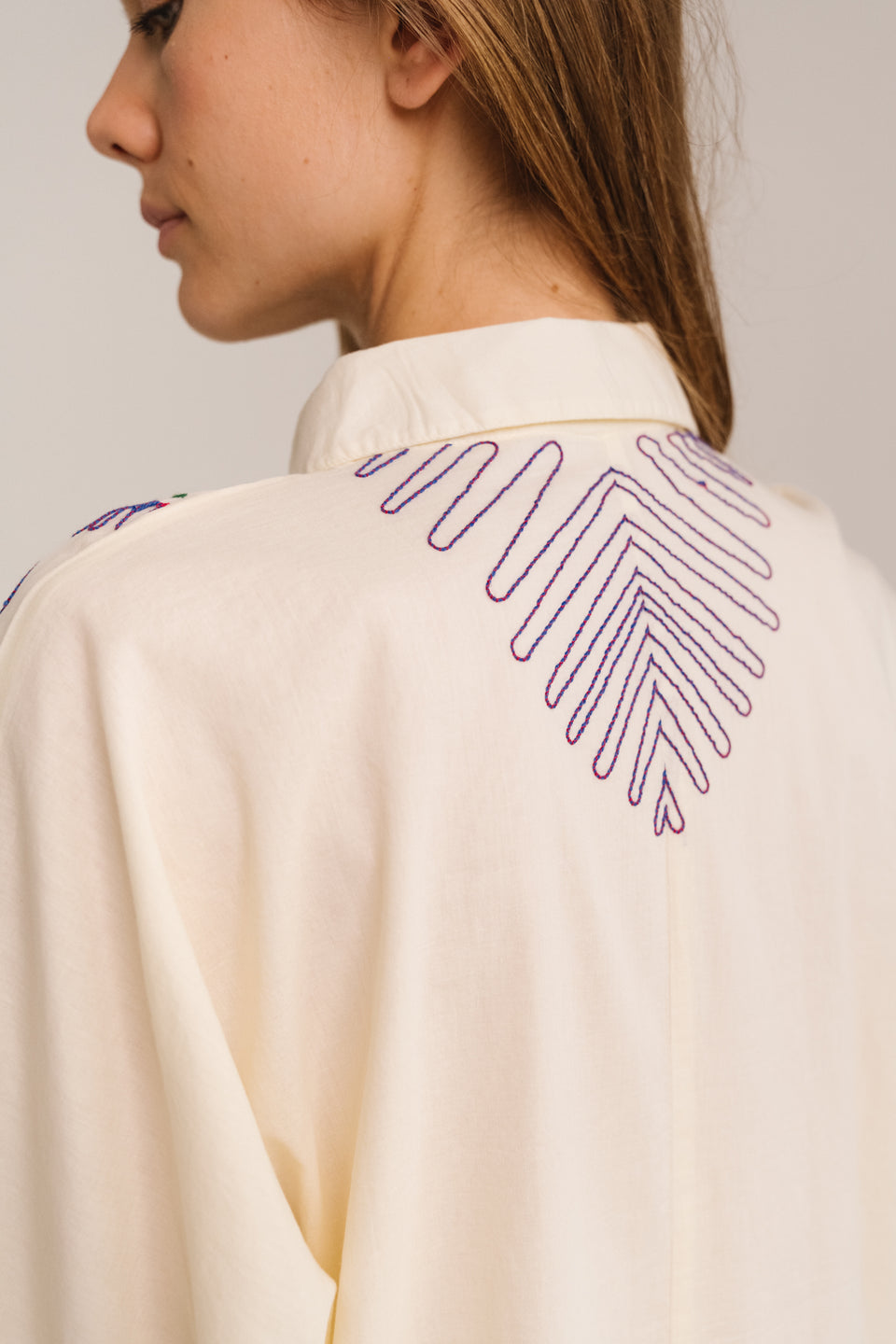 Long, oversized shirt dress, fully buttoned at the front. Three-quarter length kimono sleeves and a classic shirt collar for a relaxed look. Embroidery on the front and back, fully lined.