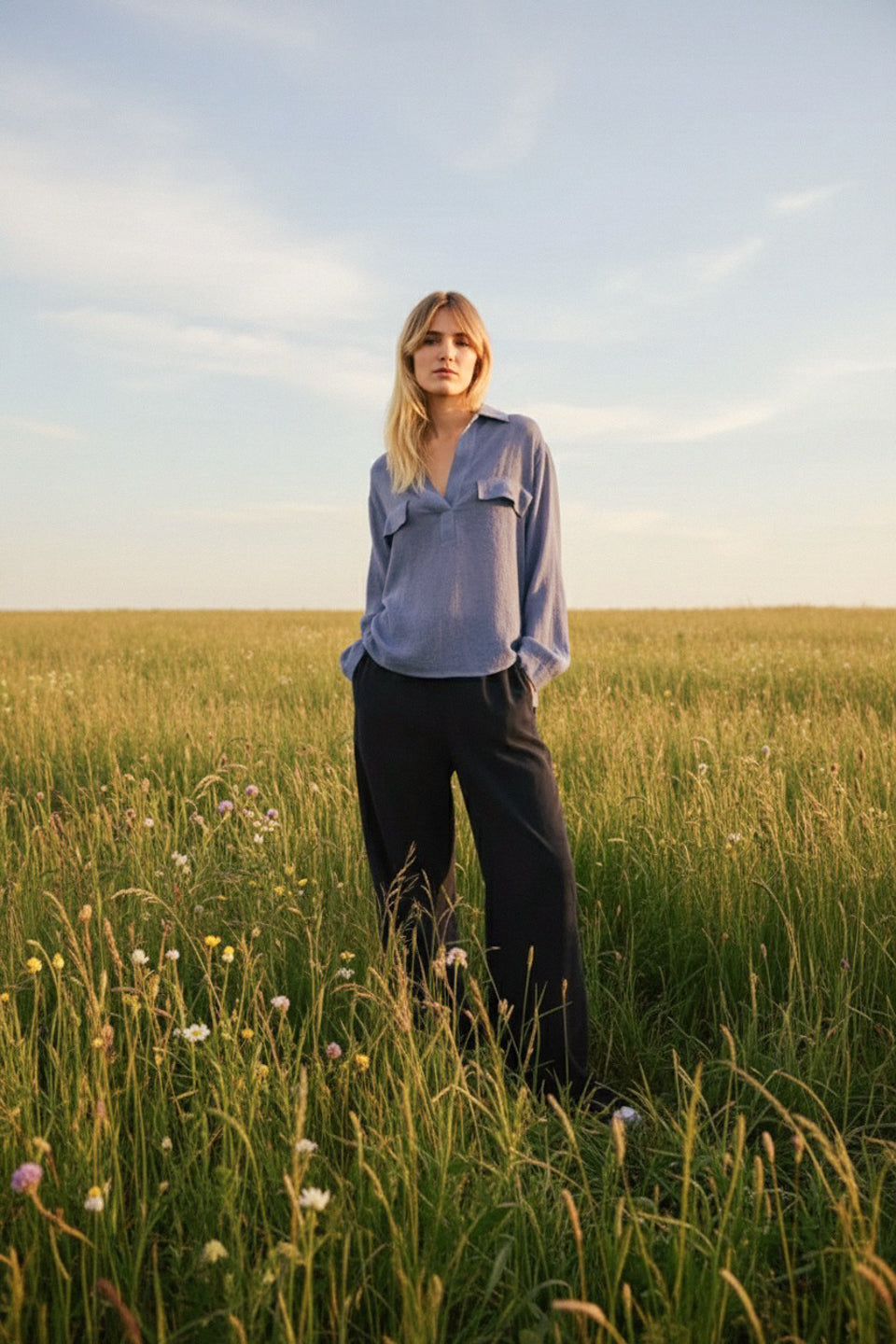 Chemise bleu chiné, confectionnée dans un mélange de viscose et laine au tombé souple et confortable. Son col esprit vareuse, ses emmanchures basses et ses fentes côtés lui apportent une allure fluide et décontractée. Les fausses poches poitrine et l’absence de boutonnage renforcent son style épuré et contemporain.