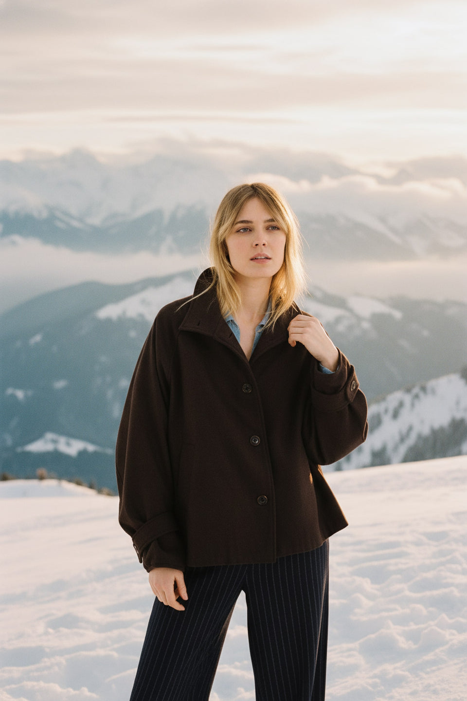 Veste courte et ample en laine mélangée couleur chocolat, entièrement doublée pour un confort optimal. Dotée de manches raglan larges, resserrées au poignet par une patte de boutonnage, elle allie style et praticité. Son col montant, son boutonnage apparent et ses poches passepoilées soulignent une silhouette à la fois élégante et décontractée.