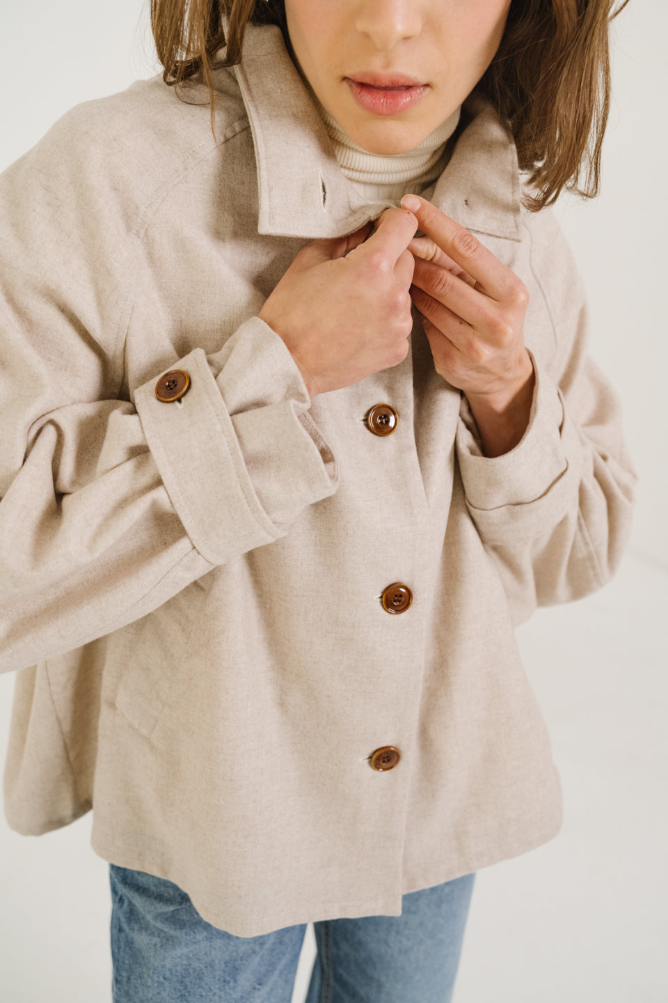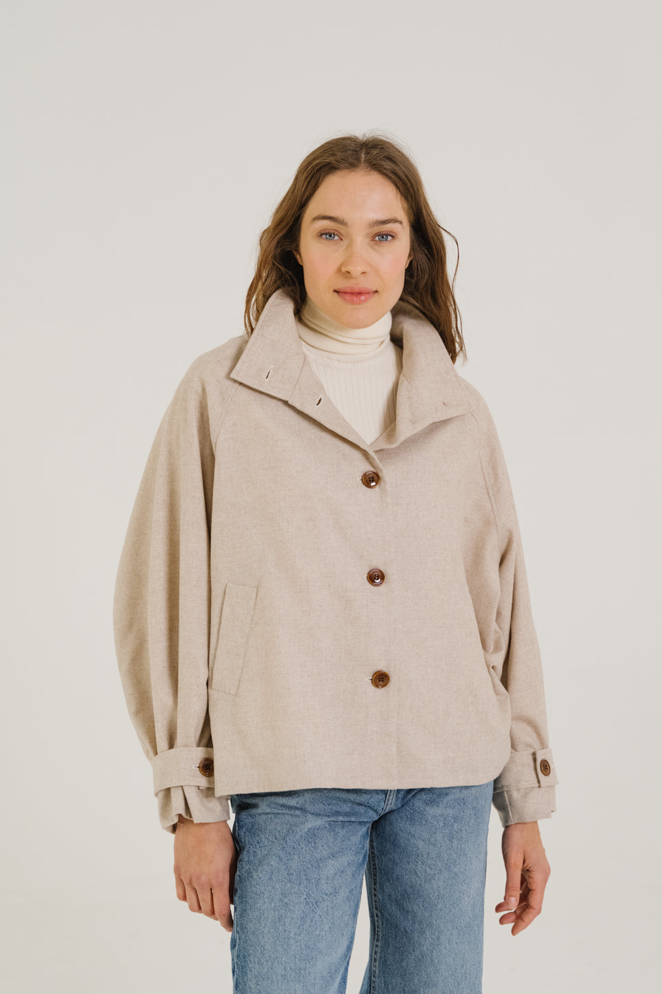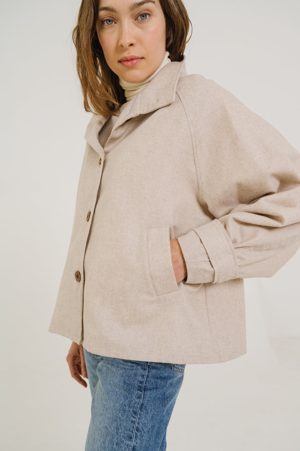 Veste courte et ample en laine mélangée beige chiné, entièrement doublée pour un confort optimal. Dotée de manches raglan larges, resserrées au poignet par une patte de boutonnage, elle allie style et praticité. Son col montant, son boutonnage apparent et ses poches passepoilées soulignent une silhouette à la fois élégante et décontractée.