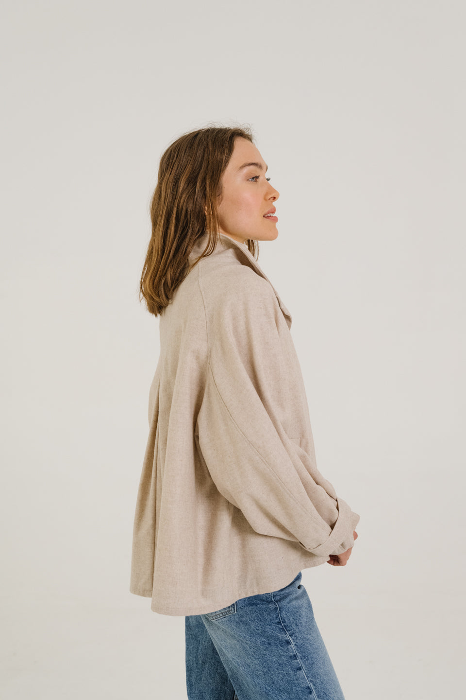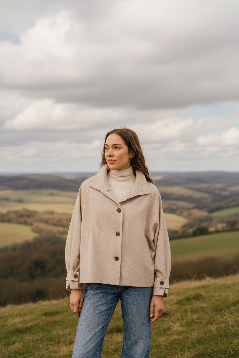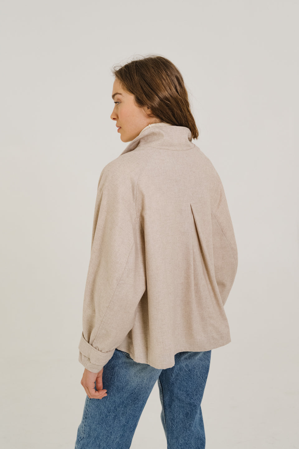 Veste courte et ample en laine mélangée beige chiné, entièrement doublée pour un confort optimal. Dotée de manches raglan larges, resserrées au poignet par une patte de boutonnage, elle allie style et praticité. Son col montant, son boutonnage apparent et ses poches passepoilées soulignent une silhouette à la fois élégante et décontractée.