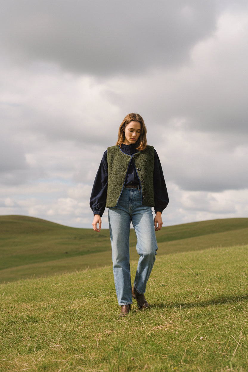 Gilet sans manches en laine bouclette kaki foncé, entièrement doublé pour plus de confort et de tenue. Son col rond et ses finitions en biais contrastant lui apportent une touche graphique et soignée. Doté de poches discrètes dans la couture et d’un bouton apparent, il combine chaleur, élégance et praticité.