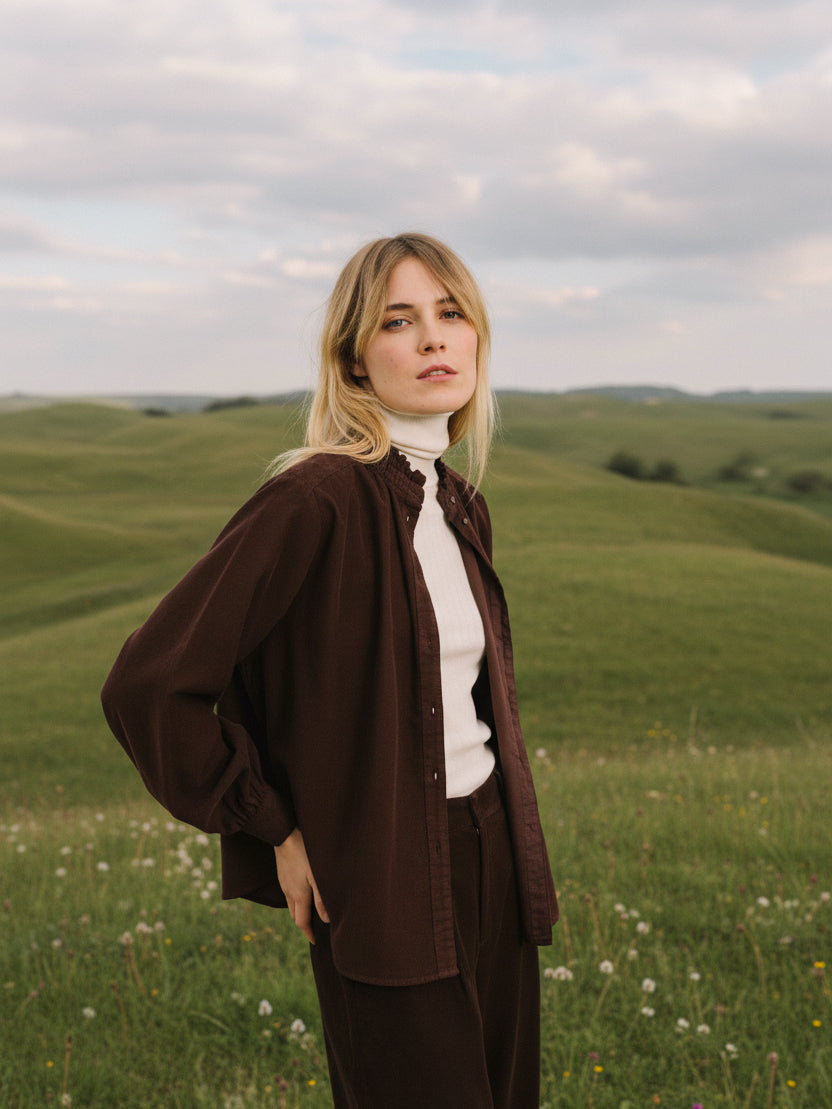 Blouse féminine en velours coucluer chocolat, confectionnée en baby cord de coton au toucher doux et délicat. Sa coupe ample et réversible permet de la porter indifféremment côté devant ou dos, pour varier les styles. Dotée d’un col haut volanté, de boutons apparents et de poignets boutonnés, elle est froncée à l’avant, au dos et aux bas de manches pour une silhouette légère et romantique.