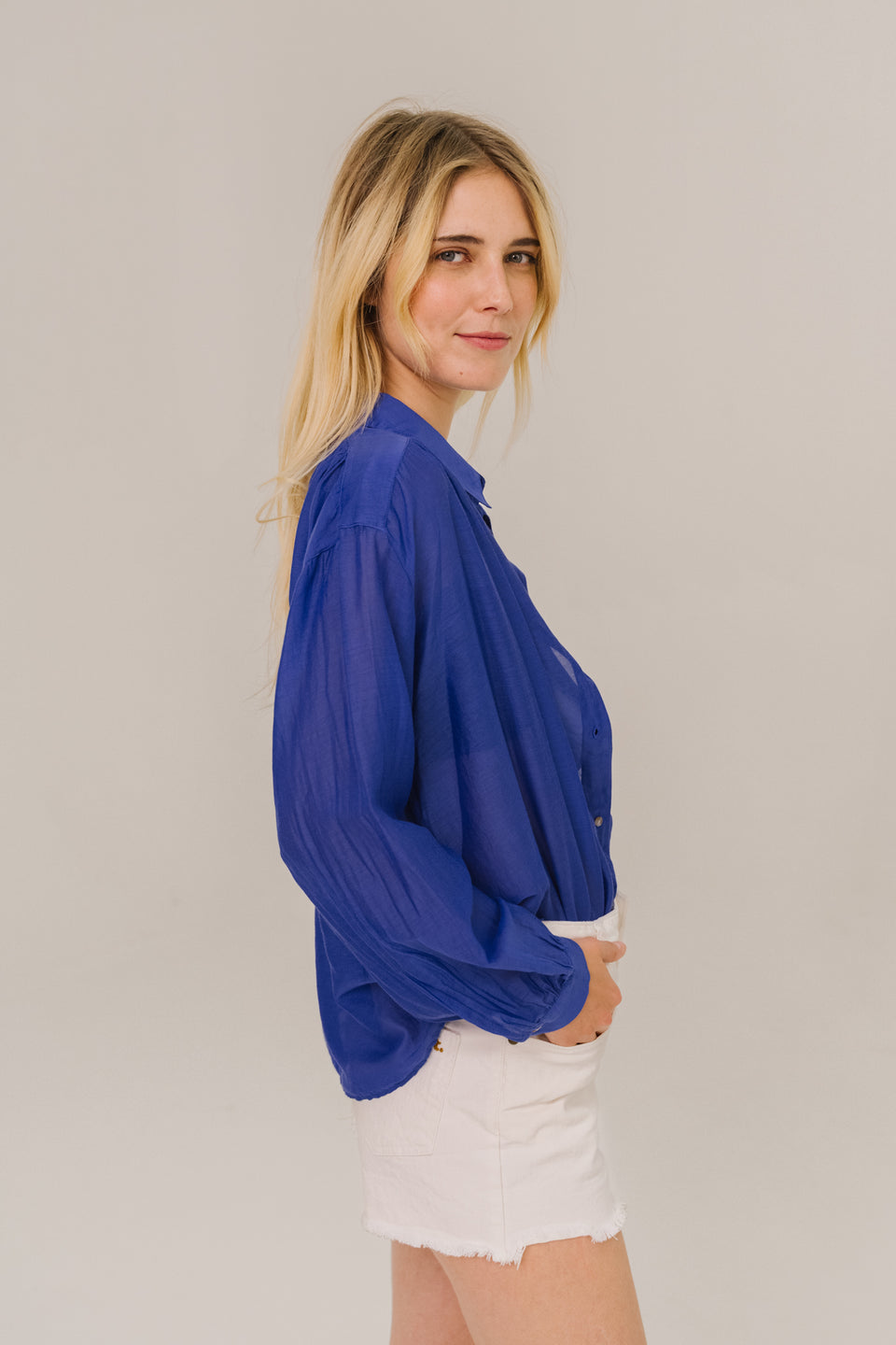 Blouse à manches longues confectionnée dans un mélange de coton et soie. Coupe ample et fluide, col chemise classique. Des fronces délicates soulignent les épaules et les poignets. Le tissu, léger et subtilement transparent, joue avec la lumière.