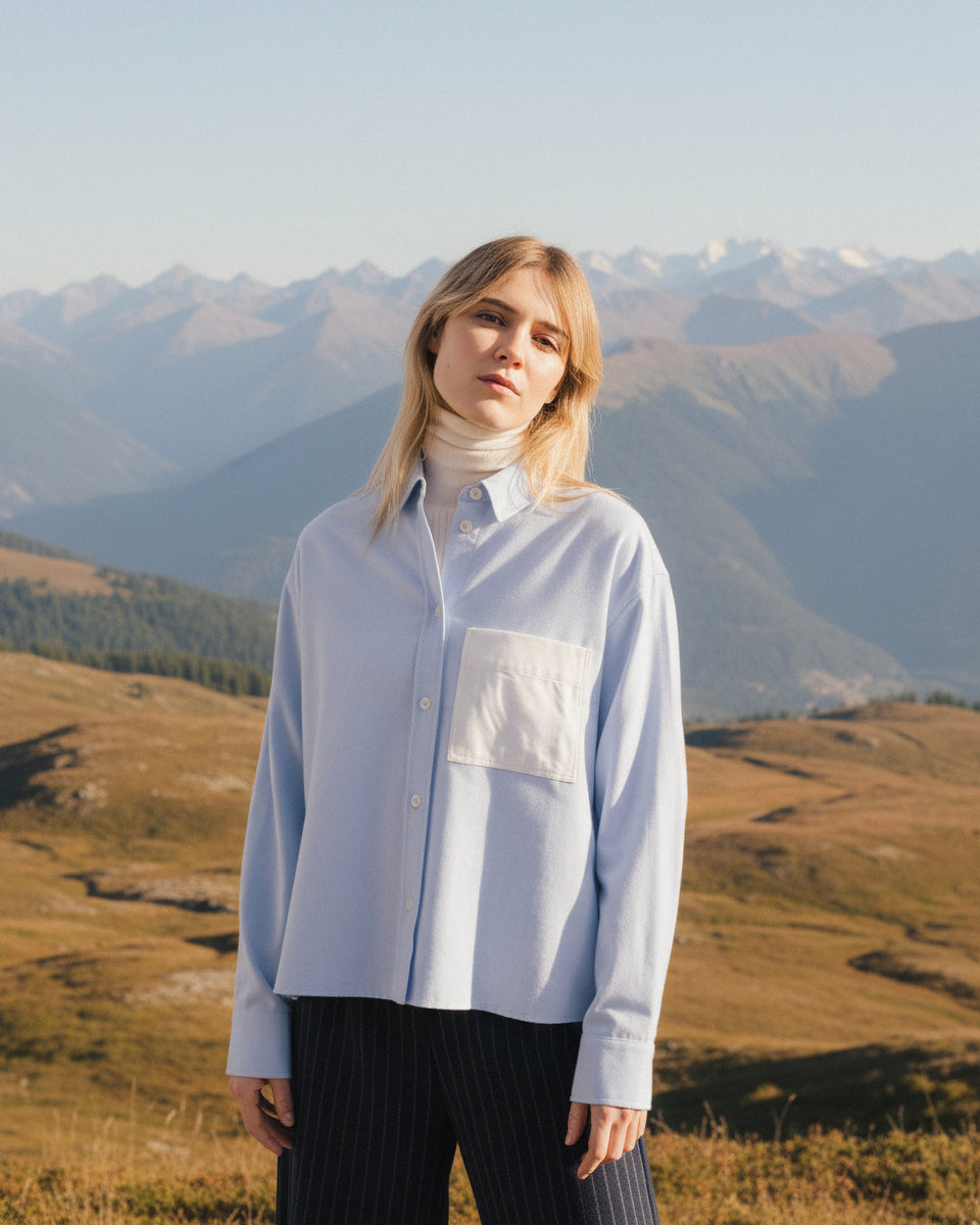 Chemise courte à manches longues, confectionnée en coton gratté bleu. Inspirée de la chemise d’homme, elle se distingue par sa coupe oversize et sa poche poitrine contrastante, pour une touche graphique et moderne. Col chemise classique, boutonnage apparent et poignets boutonnés en finition. Une pièce à la fois intemporelle et twistée.
