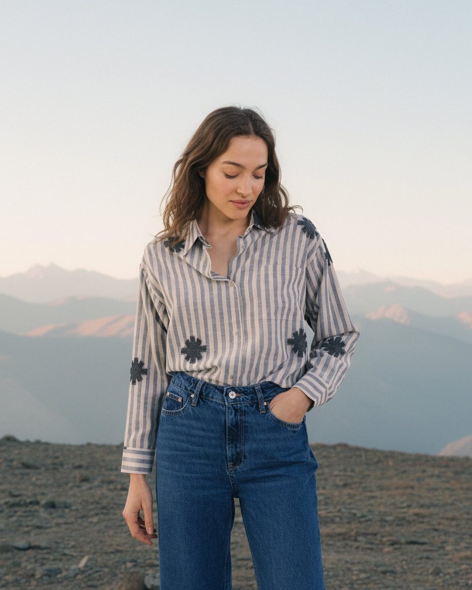 Chemise à manches longues, rayures verticales bleu et gris chiné avec motif étoiles anthracite. Confectionnée en coton et viscose. Inspirée de la chemise d’homme, elle présente une coupe légèrement oversize avec une emmanchure basse pour une silhouette décontractée. Son col classique, sa poche plaquée sur la poitrine et son boutonnage apparent lui apportent une touche intemporelle. Poignets boutonnés en finition.