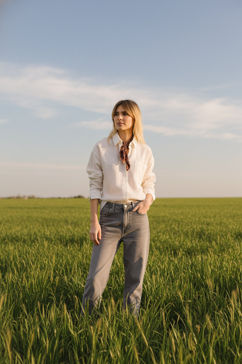 Chemise à manches longues, écru à carreaux ton sur ton en texture, confectionnée en coton et viscose. Inspirée de la chemise d’homme, elle présente une coupe légèrement oversize avec une emmanchure basse pour une silhouette décontractée. Son col classique, sa poche plaquée sur la poitrine et son boutonnage apparent lui apportent une touche intemporelle. Poignets boutonnés en finition.