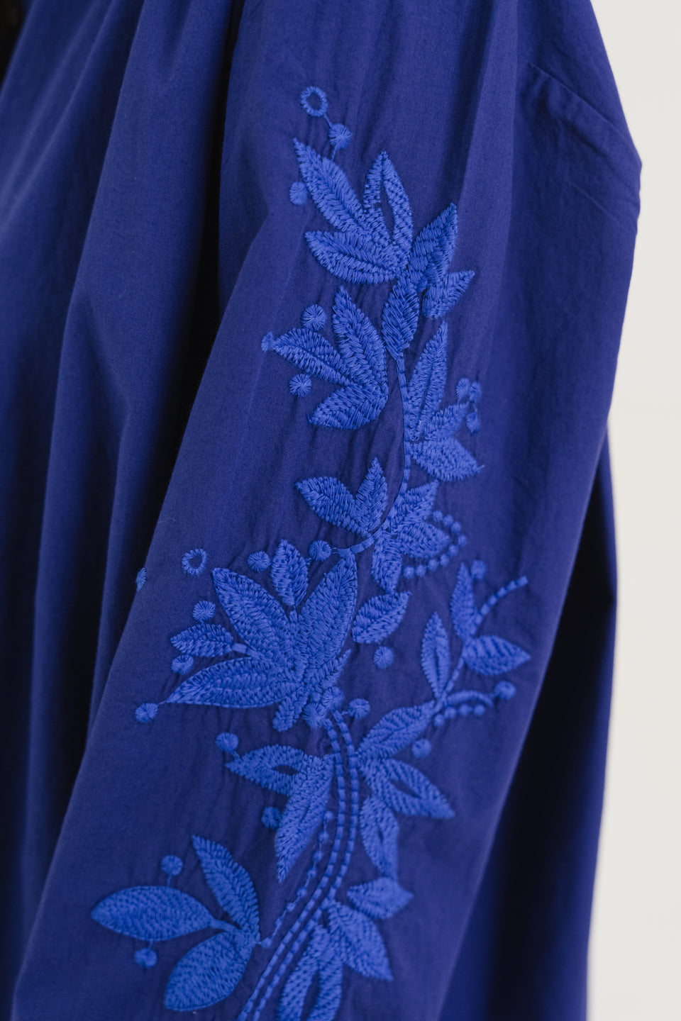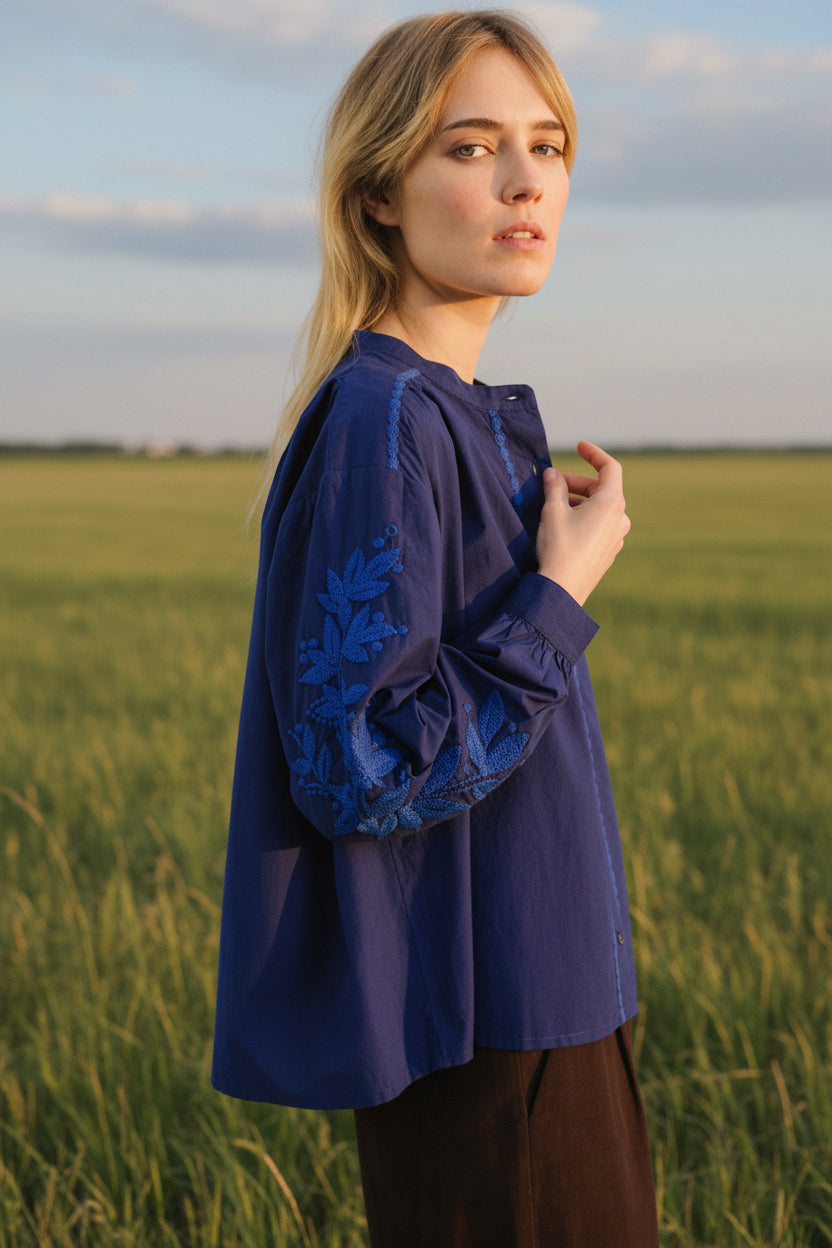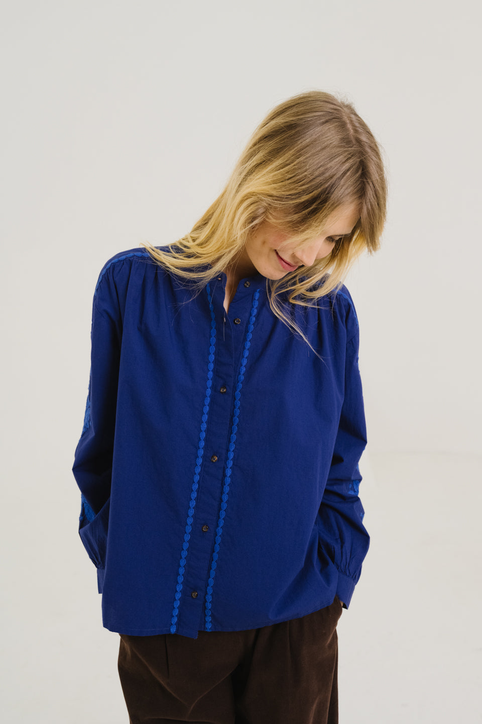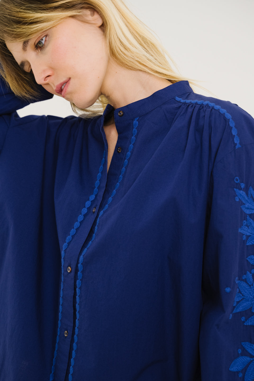Blouse féminine à manches longues bleu intense, confectionnée en popeline de coton. Sa coupe ample, froncée à l’avant et au dos, est sublimée par un col mao fin et un boutonnage apparent. Poignets boutonnés en finition. Broderies bleu claires sur les manches et empiècements.