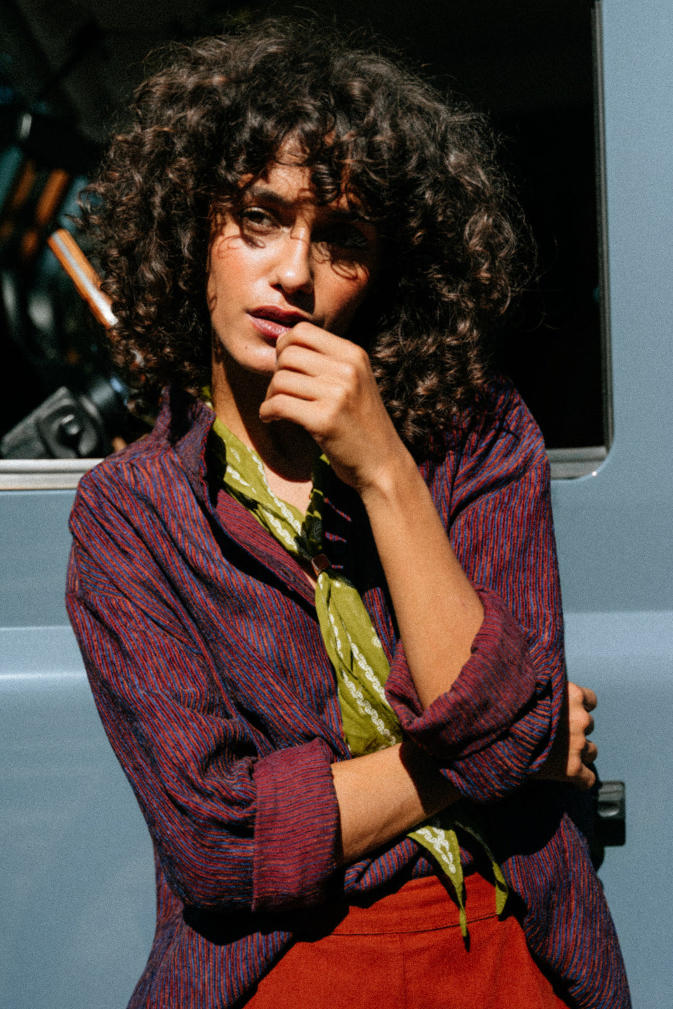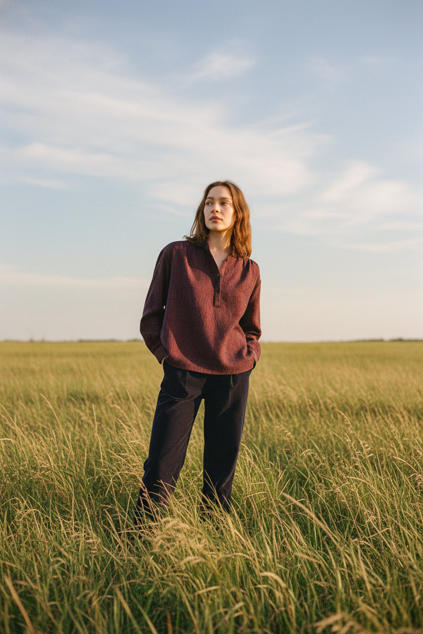 Blouse à col montant, confectionnée en velour rayé rouge et bleu. Sa coupe ample et ses emmanchures basses lui confèrent une allure fluide et décontractée. Froncée à l’avant et au dos, elle est soulignée par une patte polo et des bas de manches fermés par un bouton, pour une finition subtilement féminine.