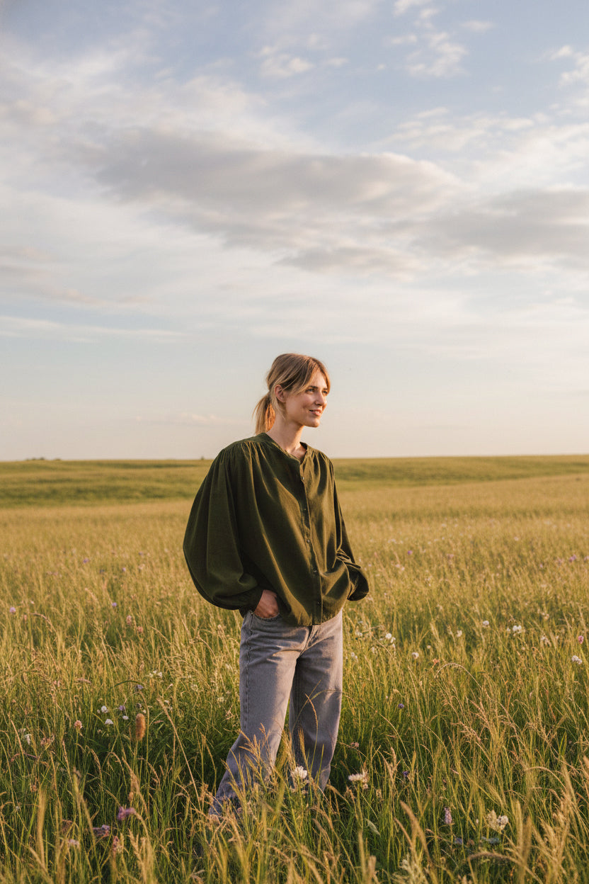 Blouse unie à manches longues, confectionnée en coton vert. Sa coupe très ample et fluide est soulignée par un col mao fin et des fronces à l’avant, au dos et en bas de manches. Les manches bouffantes apportent du volume et de la légèreté, tandis que les poignets boutonnés offrent une finition soignée et féminine.