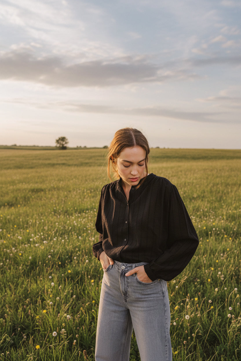 Blouse unie à manches longues, confectionnée en coton noir à rayures plumetis ton sur ton. Sa coupe ample et fluide est sublimée par un col mao fin et des fronces à l’avant, au dos et en bas de manches. Les manches légèrement bouffantes apportent volume et légèreté, tandis que les poignets boutonnés ajoutent une touche de finesse à la silhouette.