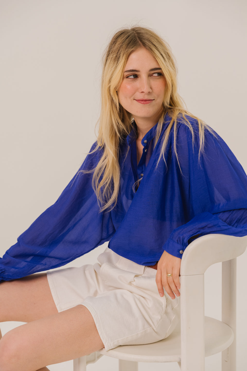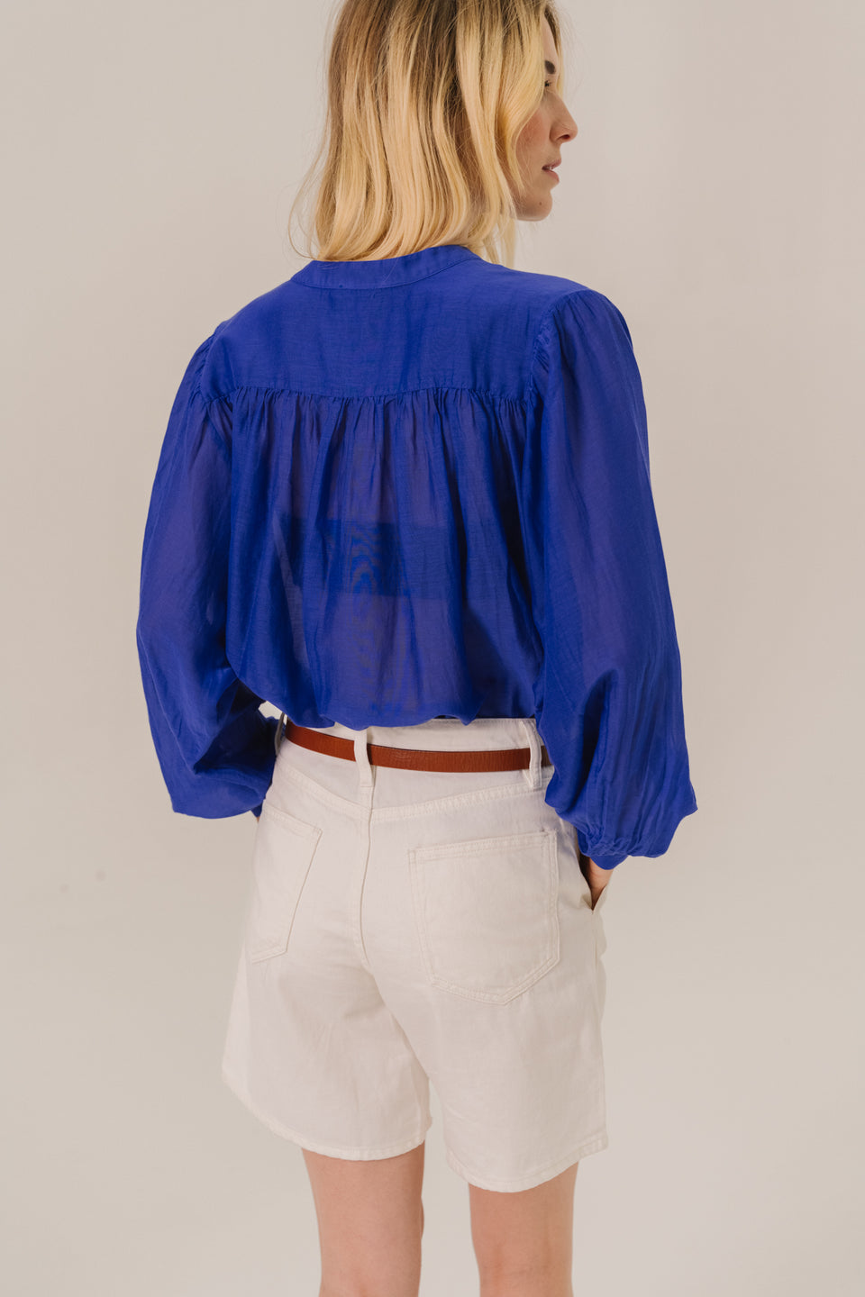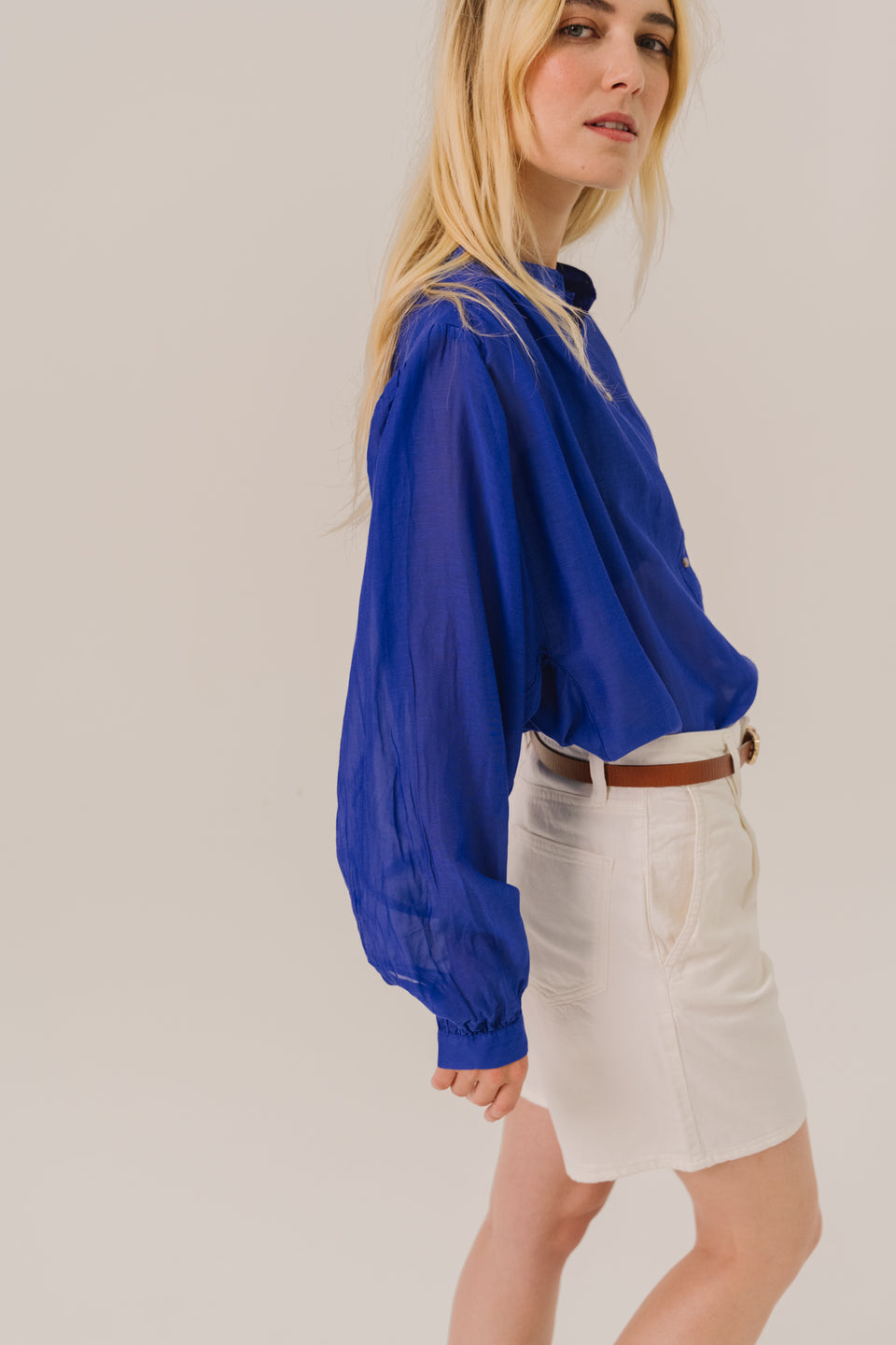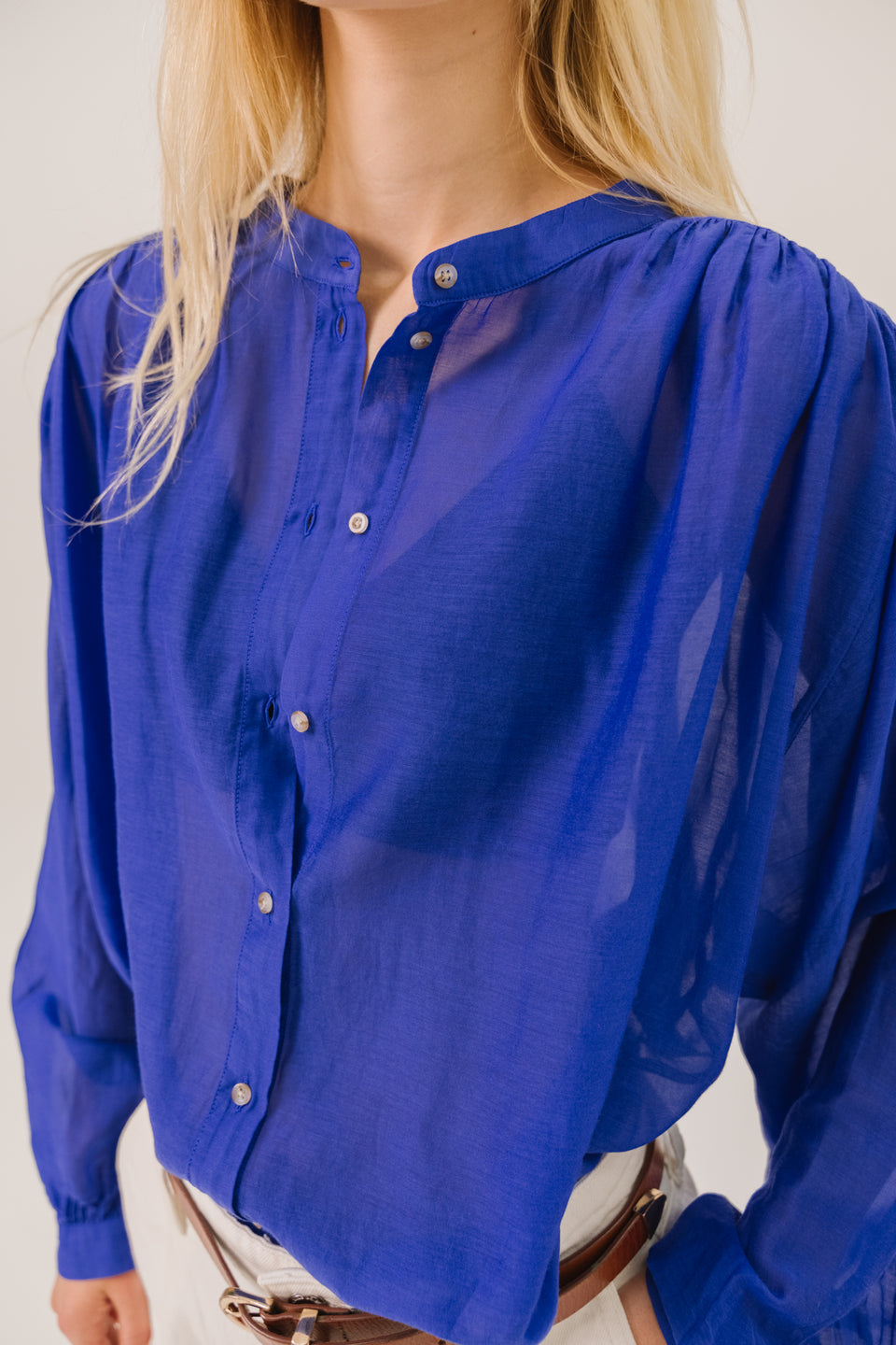 Blouse unie à manches longues en mélange coton et soie, au tombé léger et subtilement transparent. Coupe ample et fluide, col mao fin et fronces délicates à l’avant, au dos et en bas de manches. Manches légèrement bouffantes et poignets boutonnés pour une touche raffinée.