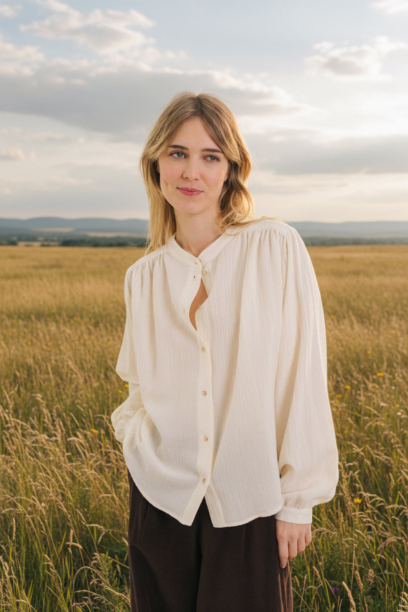 Blouse unie à manches longues, confectionnée en coton écru texturé. Sa coupe ample et fluide est rehaussée par un col mao fin et des fronces à l’avant, au dos et en bas de manches. Les manches légèrement bouffantes apportent volume et légèreté, tandis que les poignets boutonnés offrent une finition délicate et élégante.