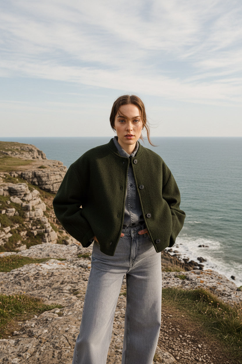 Veste ronde en laine bouillie kaki foncé, entièrement doublée, au style bomber revisité. Ses manches sont resserrées par de larges plis pour une silhouette structurée et confortable. Dotée d’un col bomber, de boutons apparents et de poches discrètes dans la couture, elle allie chaleur, modernité et élégance.