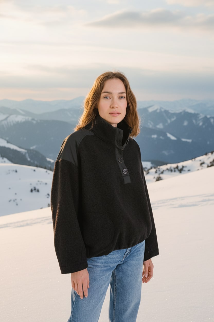 Veste courte et ample en laine bouillie noire, au style sweatshirt revisité. Non doublée, elle présente une coupe ronde avec emmanchures basses et manches resserrées par de larges plis pour une silhouette confortable et structurée. Son col montant boutonné, ainsi que les empiècements en nylon satiné anthracite aux épaules et au dos, apportent une touche contemporaine. Poches discrètes dans la couture en finition.