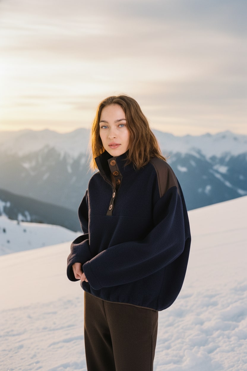Veste courte et ample en laine bouillie navy, au style sweatshirt revisité. Non doublée, elle présente une coupe ronde avec emmanchures basses et manches resserrées par de larges plis pour une silhouette confortable et structurée. Son col montant boutonné, ainsi que les empiècements en nylon satiné marron aux épaules et au dos, apportent une touche contemporaine. Poches discrètes dans la couture en finition.