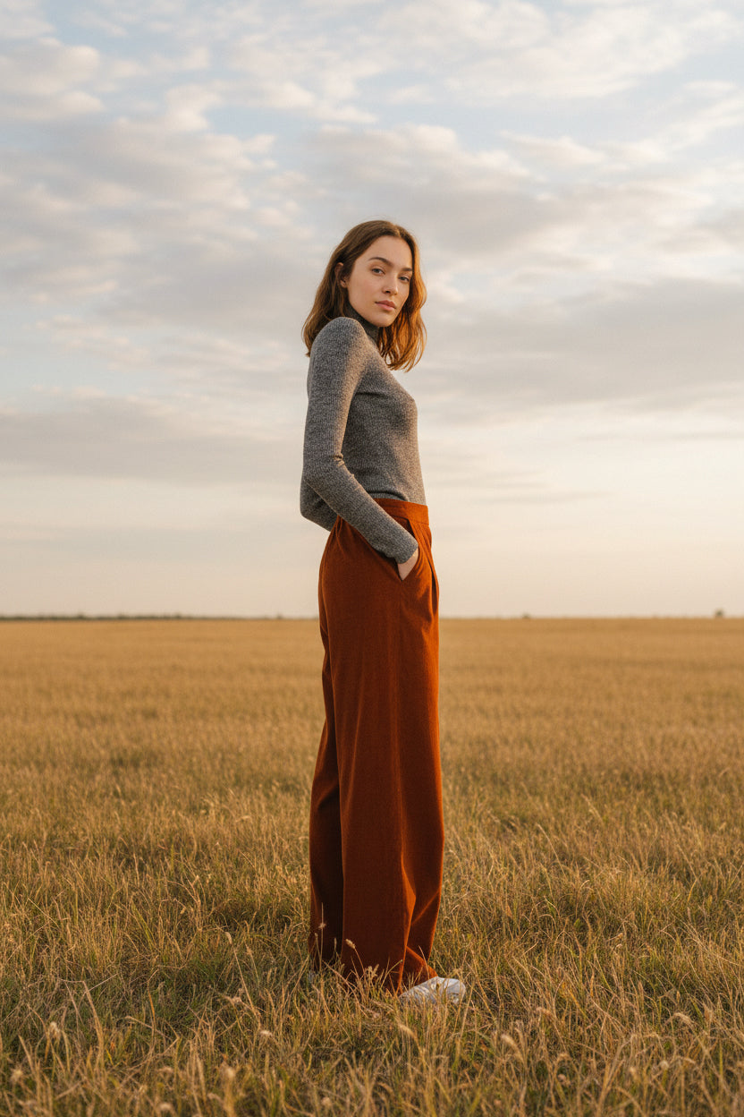 Pantalon taille normale à la jambe évasée, confectionné en baby velours couleur brique, 100% coton. Sa taille élastiquée au dos assure un confort parfait au quotidien, tandis que ses larges plis à l’avant et son ourlet généreux structurent la silhouette avec élégance. Doté de poches italiennes, il conjugue style et aisance avec naturel.