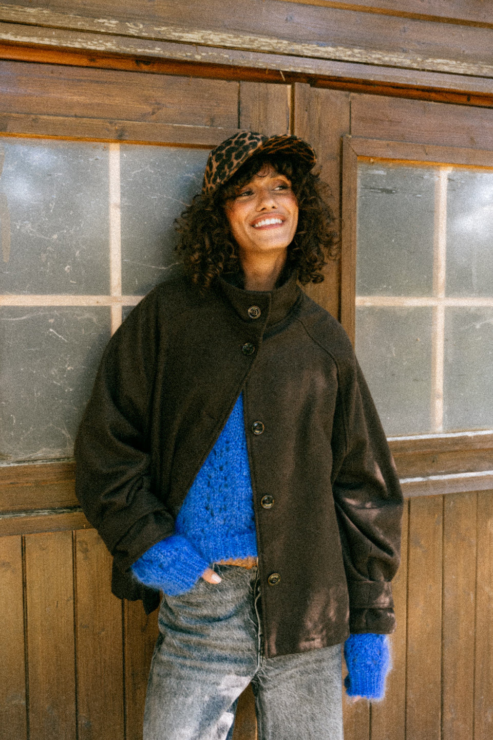 Veste courte et ample en laine mélangée couleur chocolat, entièrement doublée pour un confort optimal. Dotée de manches raglan larges, resserrées au poignet par une patte de boutonnage, elle allie style et praticité. Son col montant, son boutonnage apparent et ses poches passepoilées soulignent une silhouette à la fois élégante et décontractée.